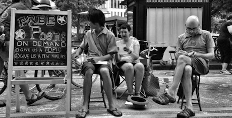 is a pop-up venue where passersby suggest poem topics and receive on-the-spot compositions.
